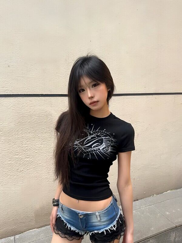 商品説明:ヴィンテージ感漂うハート柄プリントの半袖Tシャツ。夏にぴったりのスリムフィットで、黒色のショート丈デザインが特徴。