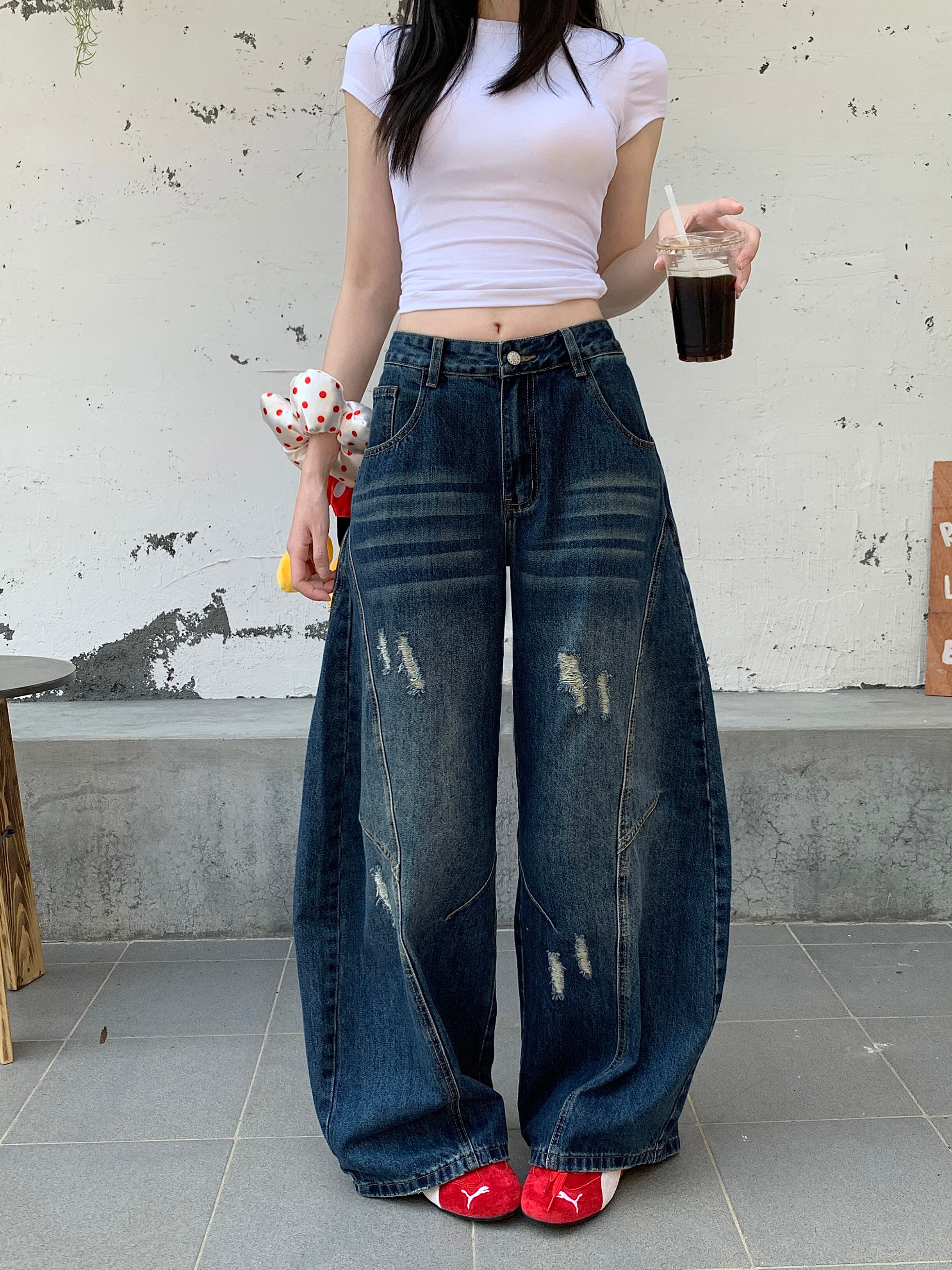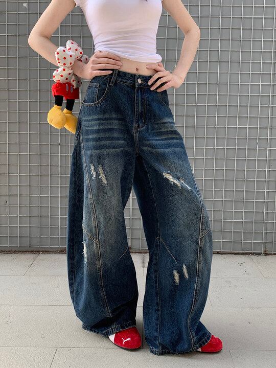 存在感抜群のワイドデニムパンツ。大胆なダメージ加工とヴィンテージ風の色落ちが魅力。ハイウエストで脚長効果も◎。個性派コーデやY2K、ストリートファッションにぴったりの1本。ユニセックスでもおすすめ。