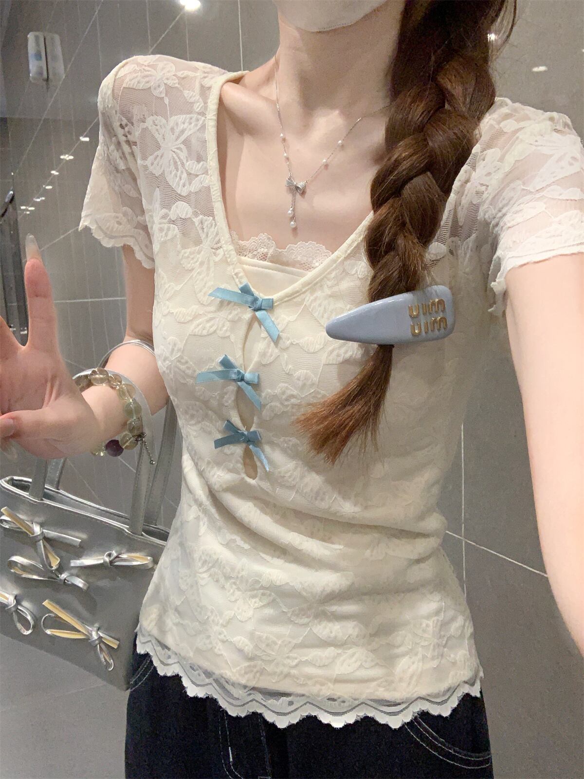 「程よい透け感」レースリボンアイスシルクカットアウトTシャツ TK0262