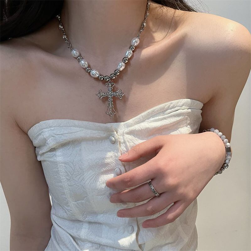 十字架デザインとパールを組み合わせたユニークなネックレス。女性だけでなく、カップルにもぴったりなアイテムです。インスタグラム風の個性的なデザインで、甘さとクールさを兼ね備えたスタイルが魅力。