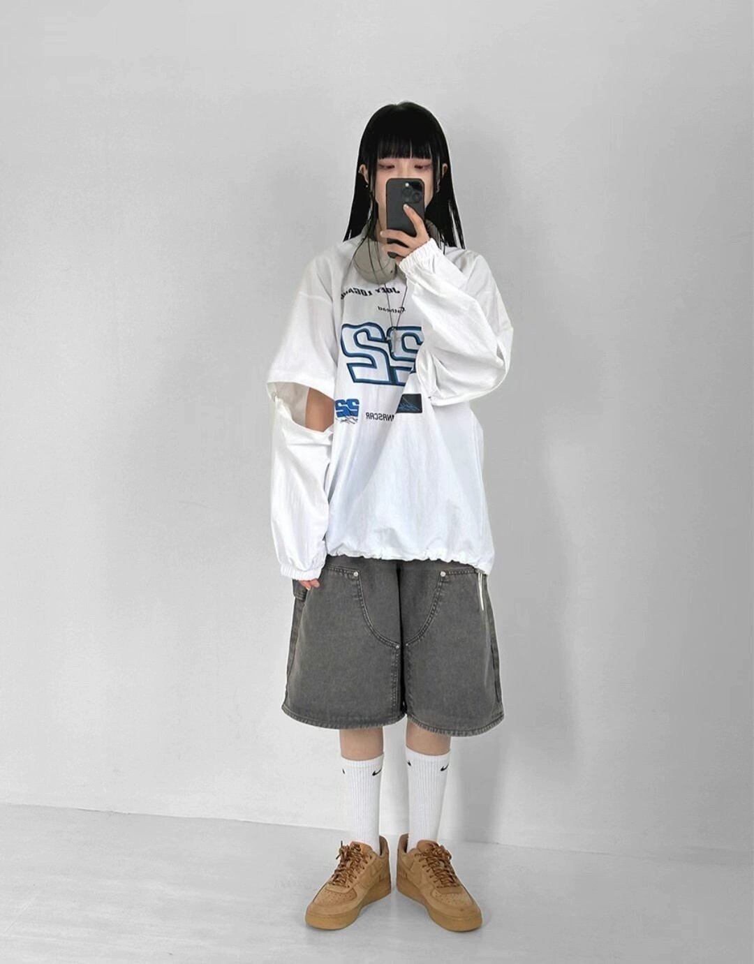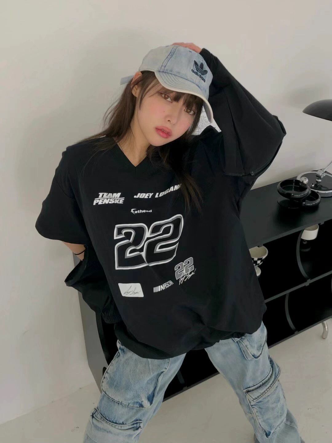 夏にぴったりの韓国インス風スポーツジャージ。Vネックと大胆なアルファベットプリントが特徴。ニット素材のショートスリーブと取り外し可能な長袖が付いており、自由なスタイルで街中でも注目を浴びるアイテムです。