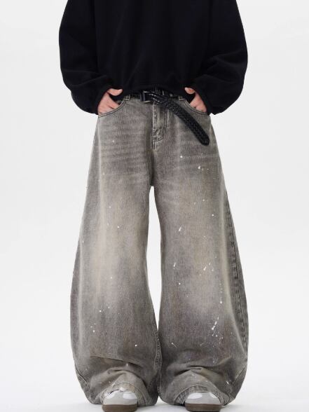 ユニークなデザインと洗練された仕上がりが特徴です。水洗い加工を施したデニム生地に、アーティスティックなペイントデザインが施されています。特徴的な弯刀シルエットとワイドな裾が、ストリートスタイルを引き立て、個性的でスタイリッシュな印象を与えます。
