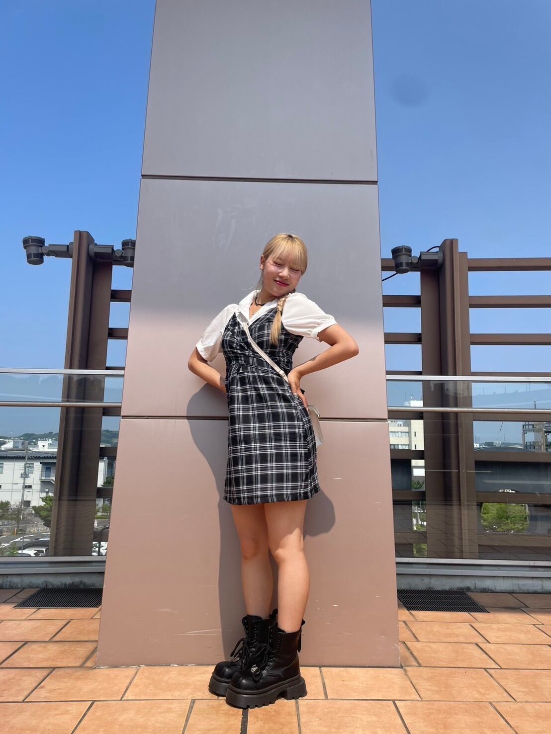 甘辛ミックスのフェイクレイヤードワンピース。シャツ風のチェック柄とパフスリーブがポイント。ウエストシェイプでスタイルアップ効果も◎。ガーリーな夏の装いにぴったりです。