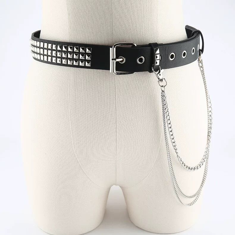 重厚感のあるメタルチェーンとスタッズがアクセントのユニセックスPUレザーベルト。