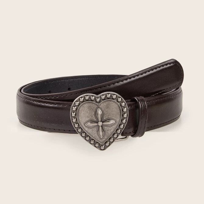 アンティーク調のハート型バックルが目を引く、こだわりデザインの細ベルト。
