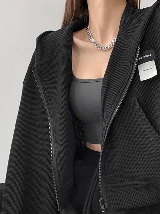 春秋の新作、薄手のワッフル編み素材を使用したフード付きショートジャケット。深灰色がシックで、カジュアルなスポーツスタイルに最適。軽やかな着心地で、スリムなシルエットを引き立てるアイテムです。