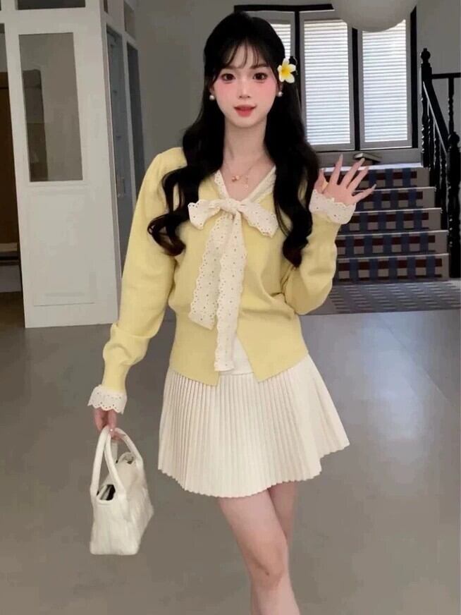 春秋にぴったりのVネックニット。柔らかな手触りとレースリボンのデザインが甘さを引き立て、ふんわりとしたガーリースタイルに。可愛さと着心地を両立した一枚です。