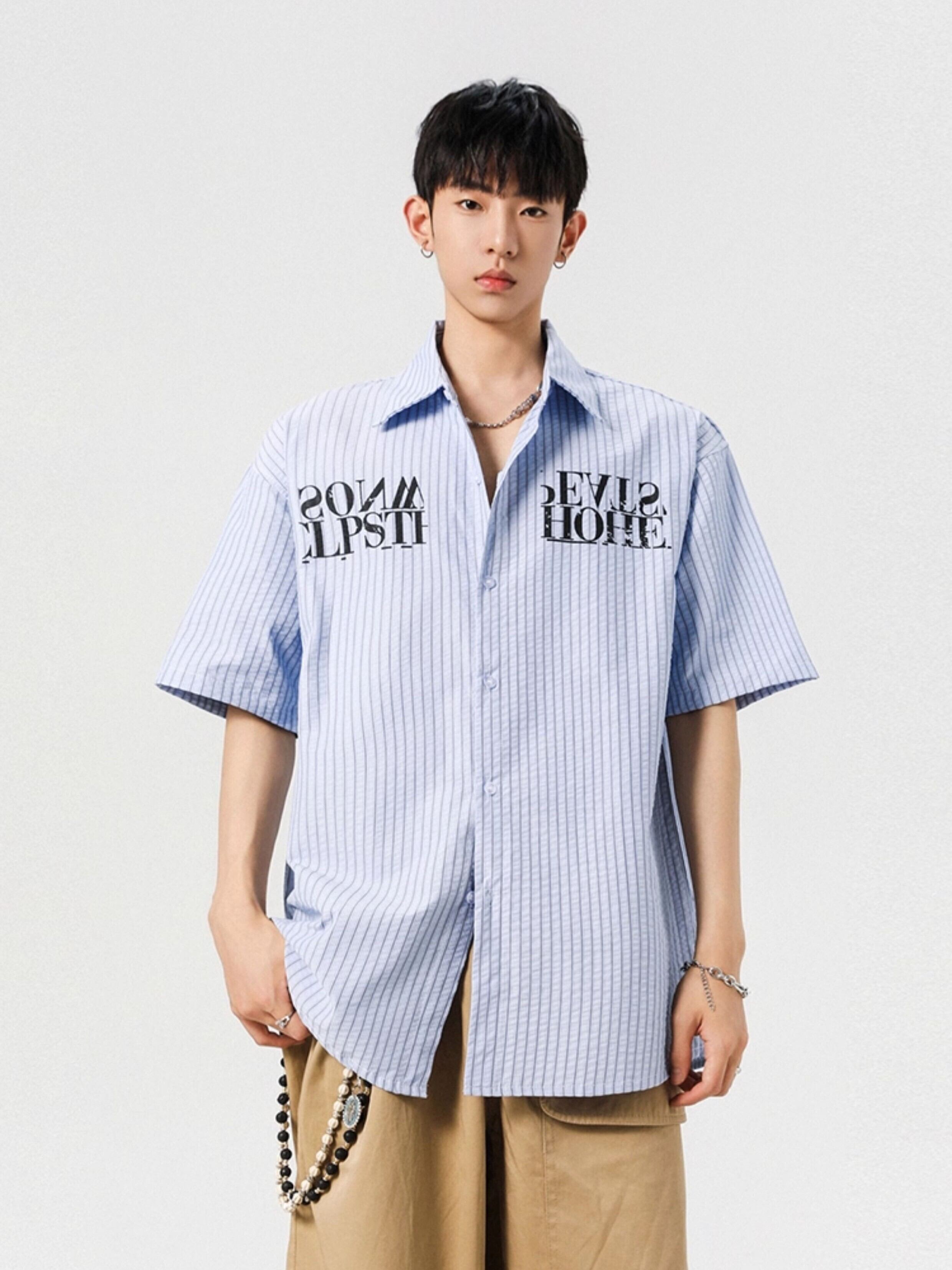 柔らかいパフコットン素材を使用したストライプ柄の半袖シャツ。男女兼用で、ゆったりとしたシルエットが魅力。背面にはトレンド感のあるロゴプリント入りで、アメカジやカレッジ風のコーデにぴったりな一枚です。