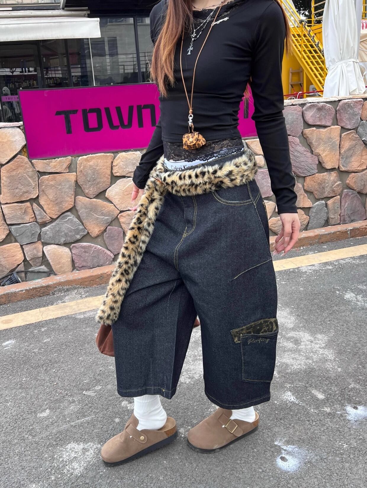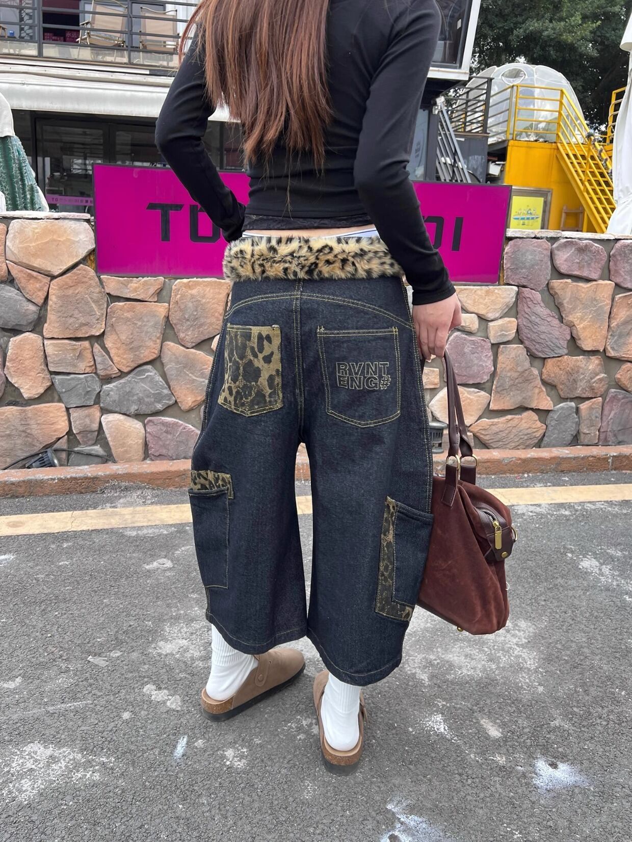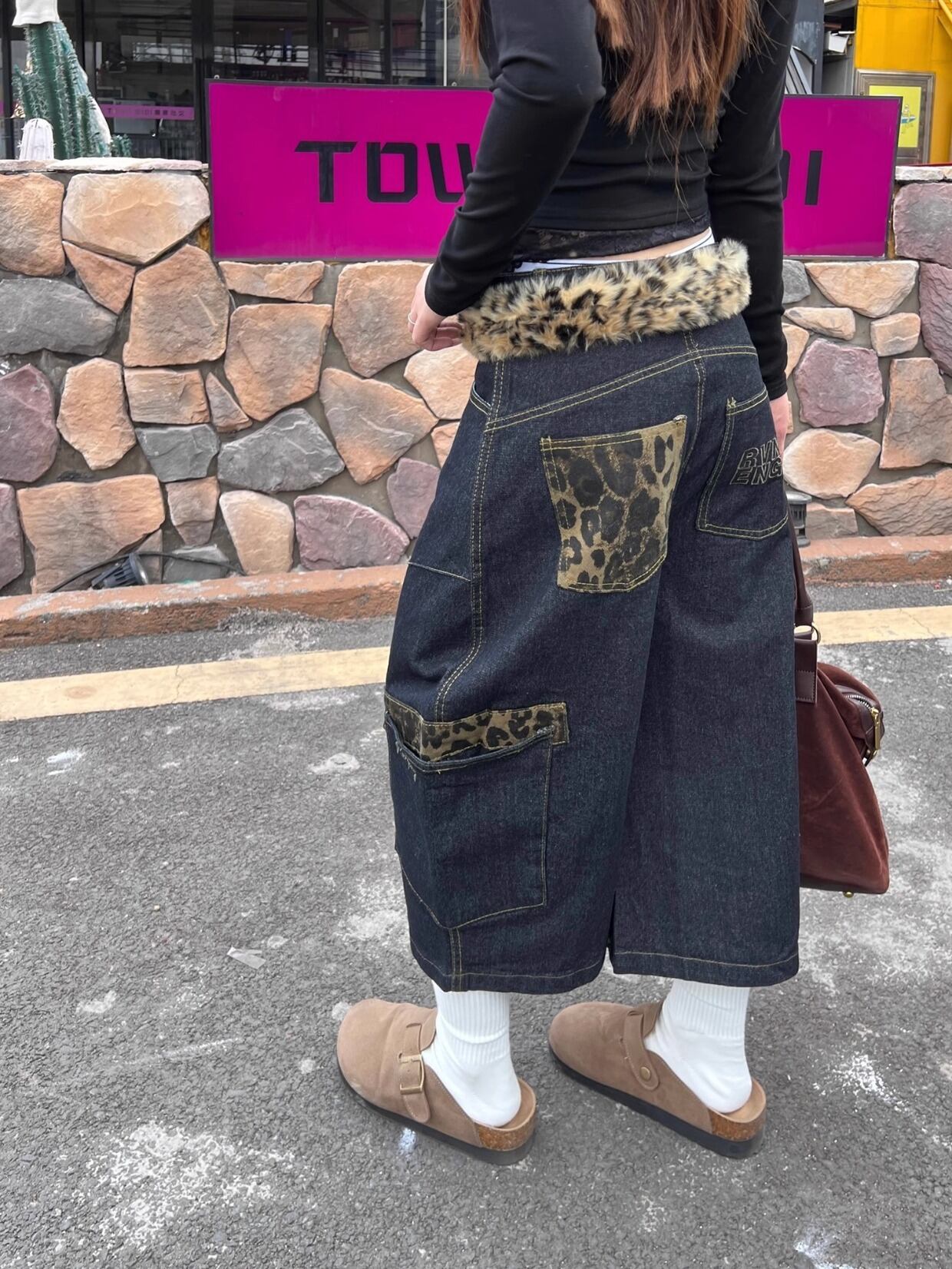 レオパード柄の切り替えが目を惹く七分丈デニム。大きなポケット付きで実用性も◎。ユニセックスで着られるゆったりスタイル。