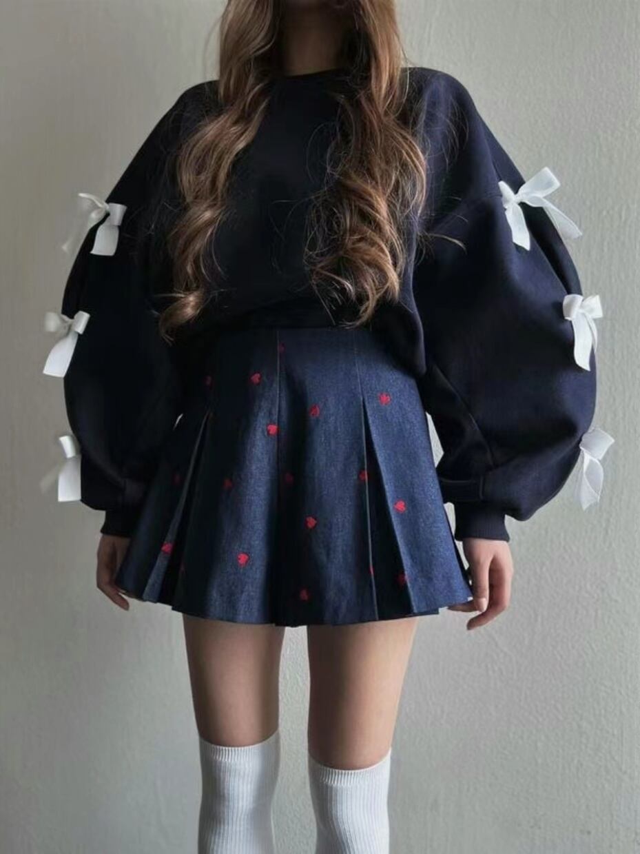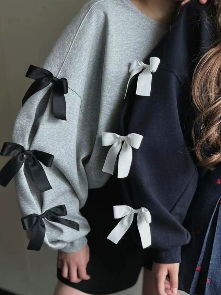 胸元のリボンが可愛らしいアクセントになり、シンプルながらも華やかな印象を与えます。ゆったりとしたシルエットで着心地が良く、デイリーコーデからお出かけまで幅広く活躍。秋のカジュアルスタイルにぴったりな万能トップスです。