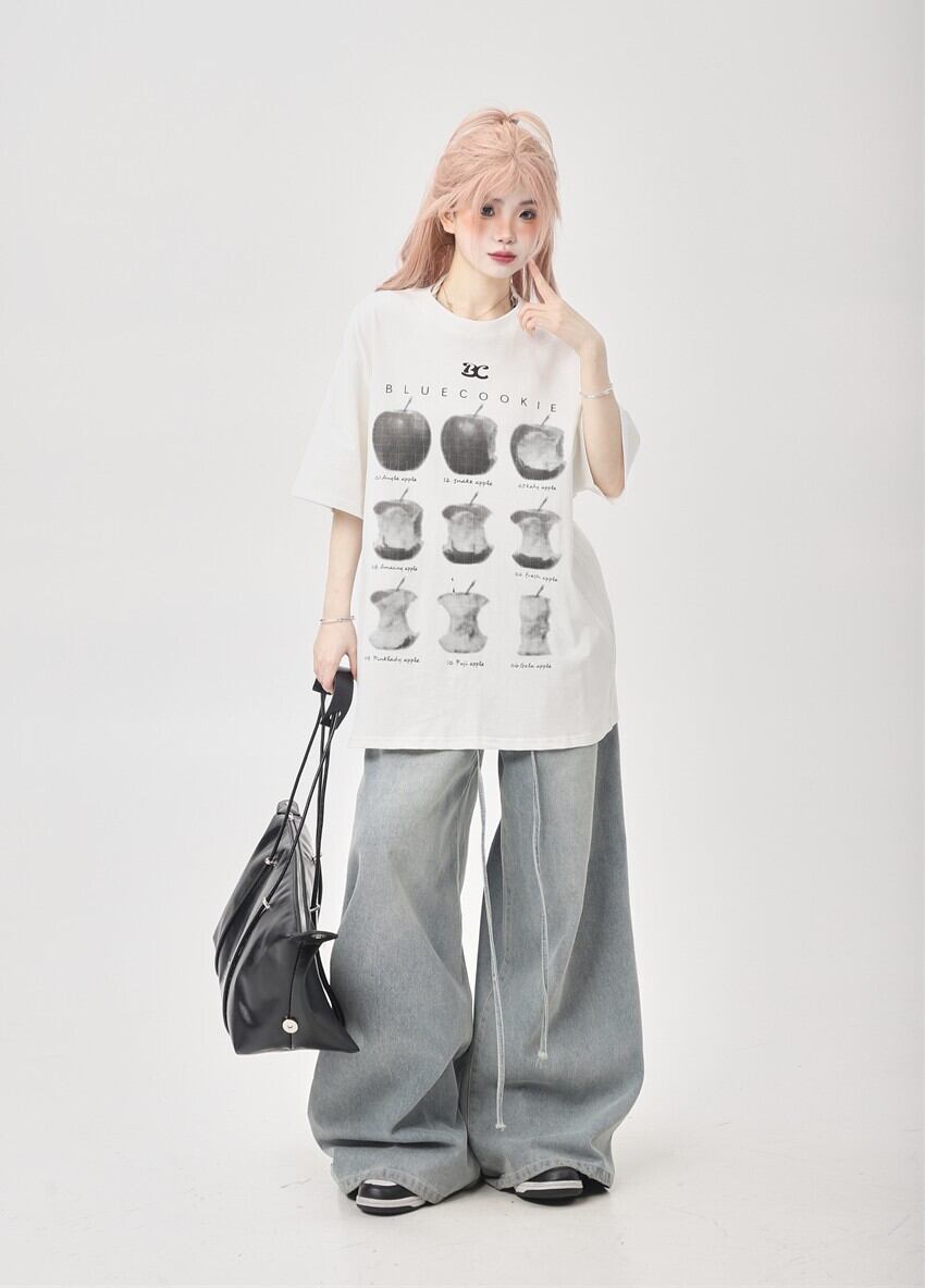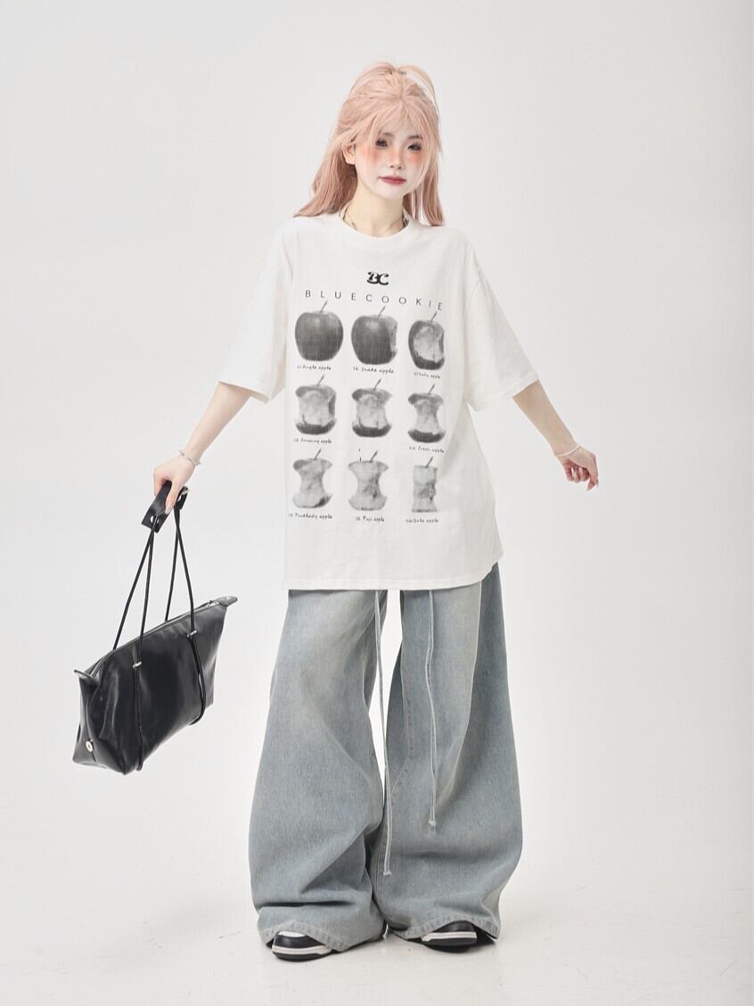 2025年夏新作の美式ヴィンテージ風Tシャツ。白地に印象的なプリントが映える1枚で、ゆったりとしたシルエットが体型をカバーしつつトレンド感も抜群。ユニセックスでペアコーデにも◎。