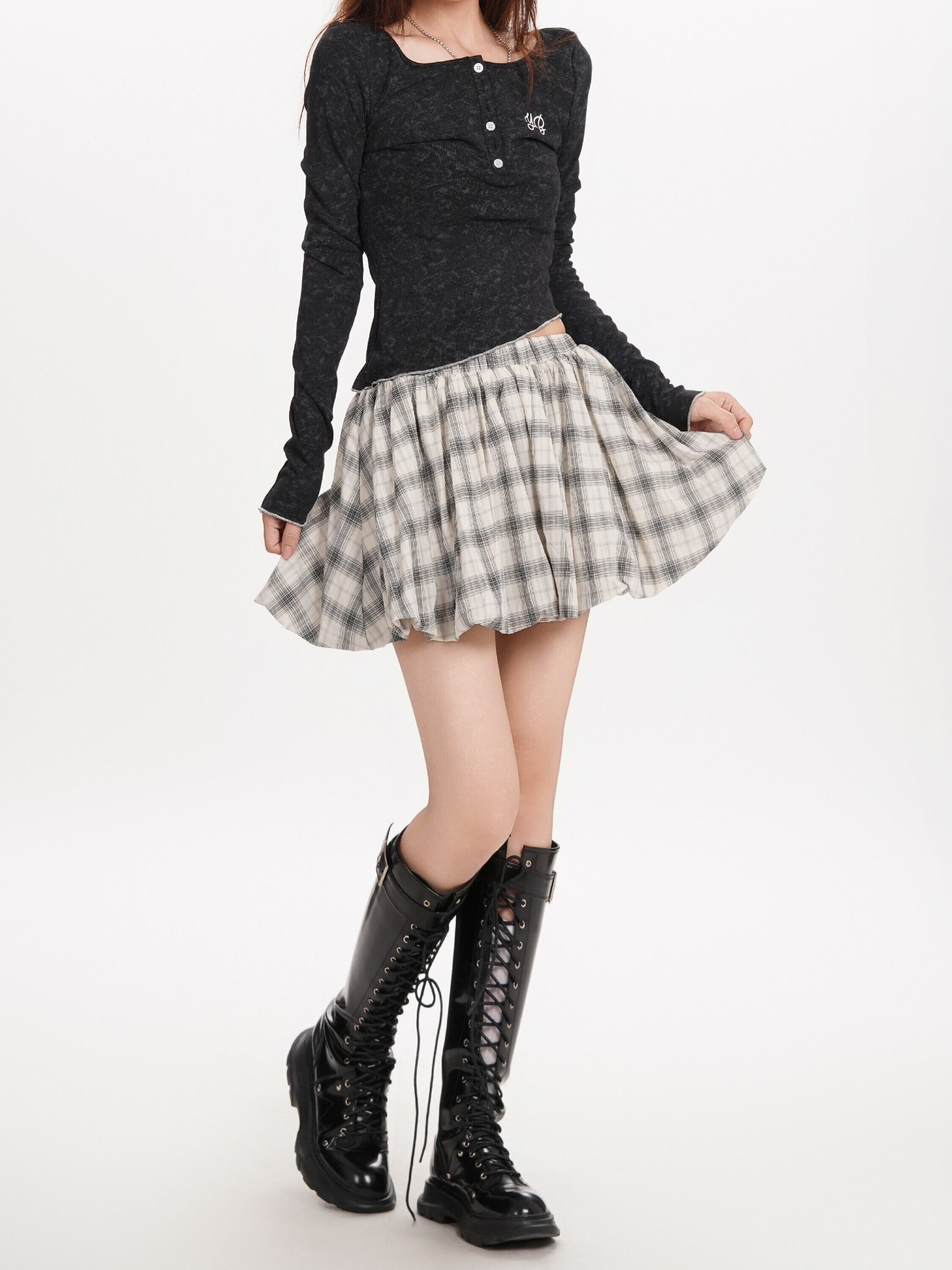 タイダイ長袖Tシャツ ワイドネック フリル付きTK0301 ブラック/グレー2色展開