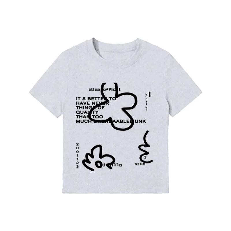 個性的なプリントが魅力のショート丈Tシャツ。正肩シルエットとウエストラインを引き立てるデザインで、夏のスタイルを美しく仕上げます。