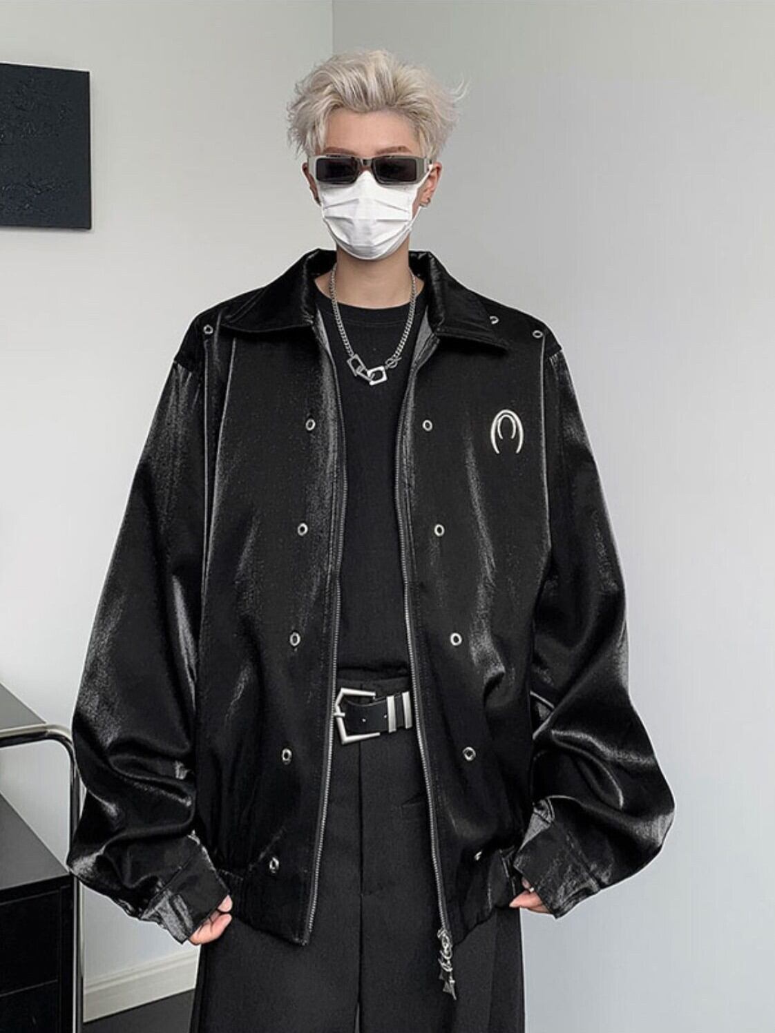 メタリックなラペルと肩パッドが特徴のショートジャケット。ミニマルなデザインでありながら、個性的な印象を与えるアイテムです。春秋のコーディネートに最適な、スタイリッシュで機能的なジャケットです。