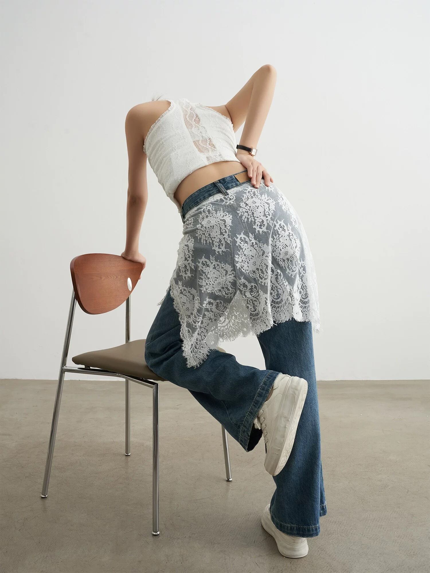 レースの切り替えデザインを取り入れた、フェイクレイヤード風デニムパンツ。