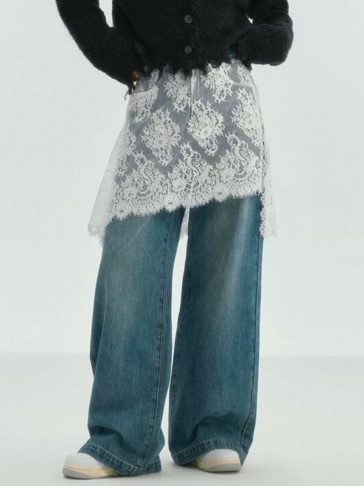 レディース レース切り替え風 フェイクレイヤード ワイドストレート ロング丈デニムパンツ