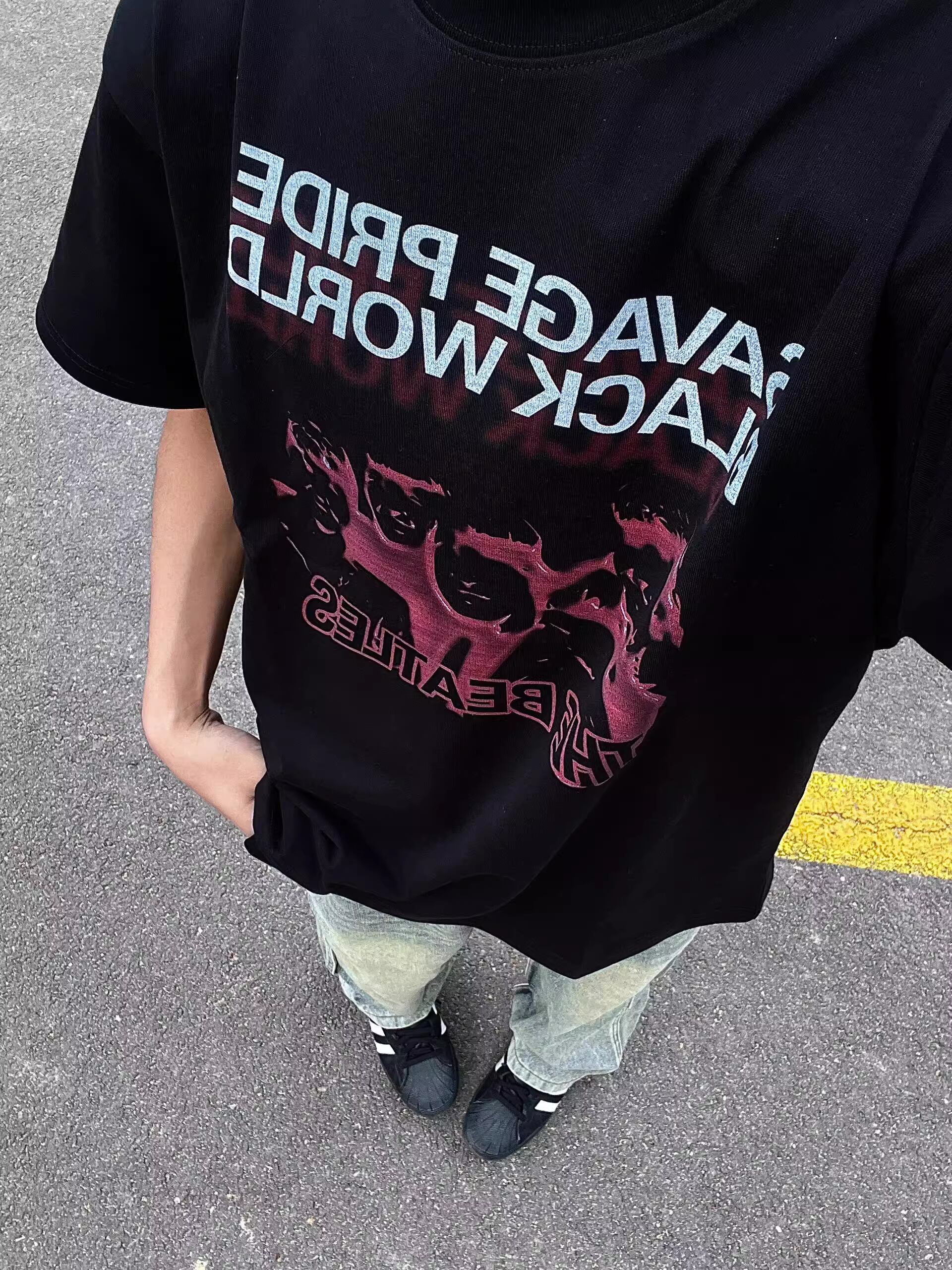 このビートルズ風オーバーサイズプリントTシャツは、1960年代のレトロな雰囲気と現代のストリートファッションを融合させたアイテムです。フロントにはバンドの象徴的なロゴとグラフィックが大胆にプリントされ、ヴィンテージ感溢れるデザインが特徴です。
