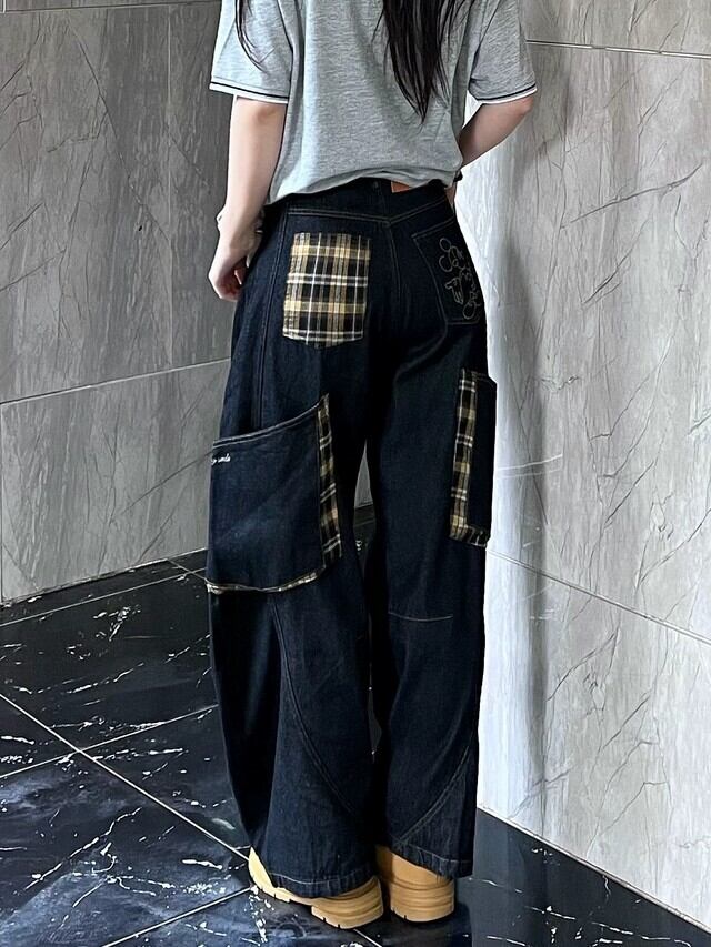 商品説明:ヴィンテージ感のあるチェック柄ポケットをサイドにあしらったワイドデニム。大きめのカーゴポケットがアクセントとなり、収納力とデザイン性を両立。男女兼用で着こなしやすく、ストリートコーデやキャンパスライフ、休日のお出かけにも活躍する一本です。