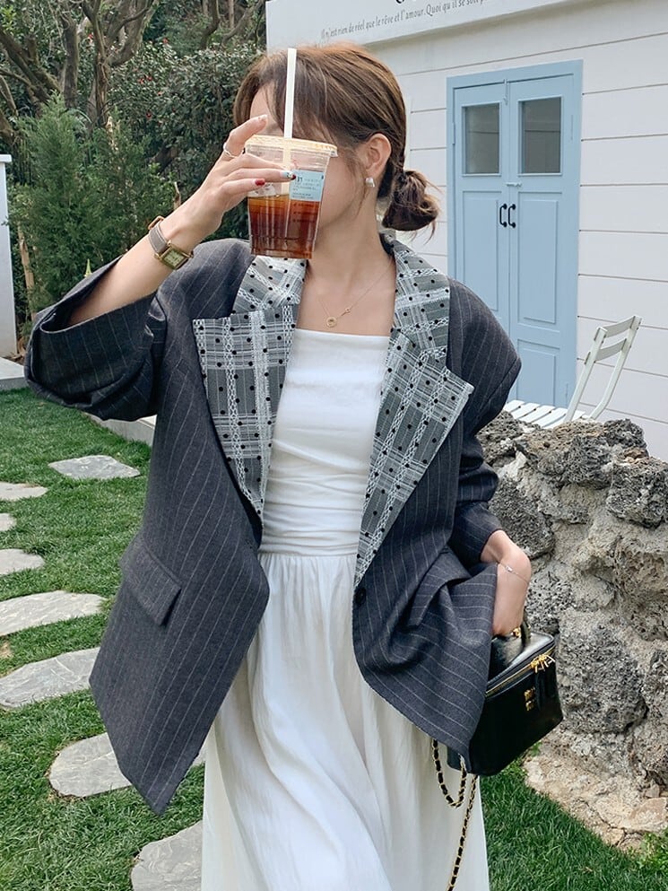 商品説明: 細かいストライプ柄がベースになっていて、濃い色と薄い色がまじり合い、どこかレトロな雰囲気のあるジャケットです。