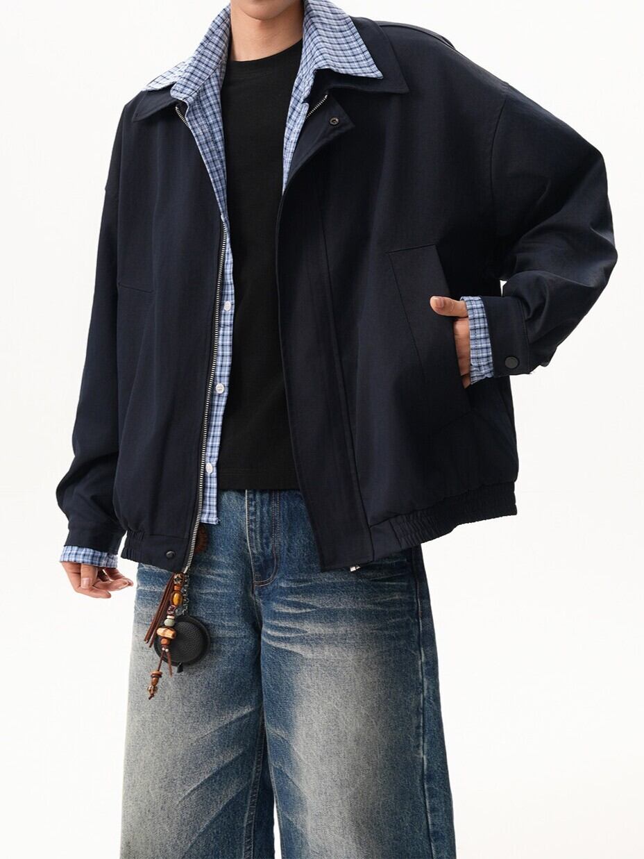 商品説明:ブルー×ブラックのバイカラーが特徴的なフェイクレイヤードアウター。シンプルでありながら、デザインにアクセントを加え、春のコーデにぴったり。着回しやすく、デイリーに活躍する一枚です。