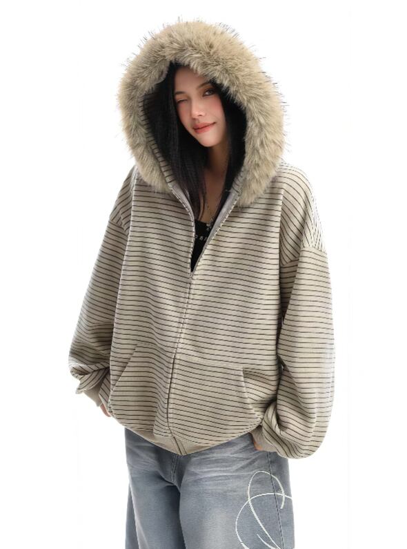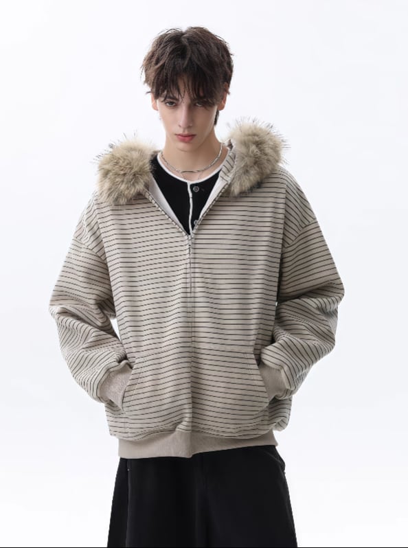 商品説明:ふわふわのファー襟がとってもおしゃれで、顔まわりを華やかに見せてくれます。ストライプデザインでどんなコーデにも合わせやすく、着回し力バツグン。