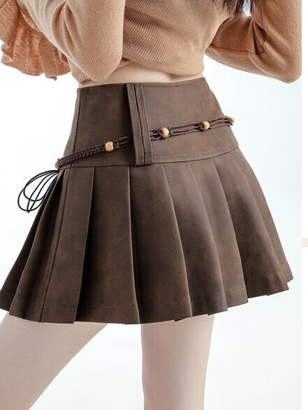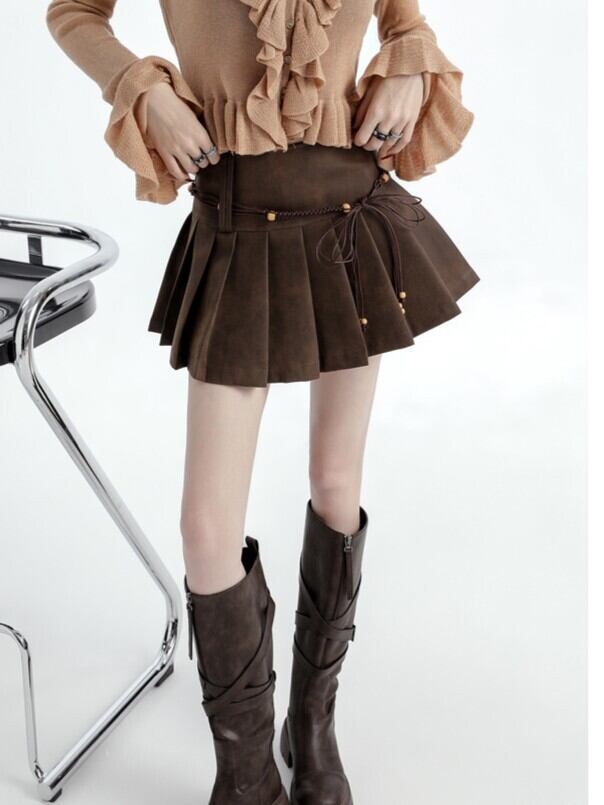 商品説明:柔らかなスエード調素材で仕上げた美式レトロなプリーツミニスカート。ブラウンカラーが秋らしく、ハイウエスト×Aラインシルエットで脚長効果も抜群。