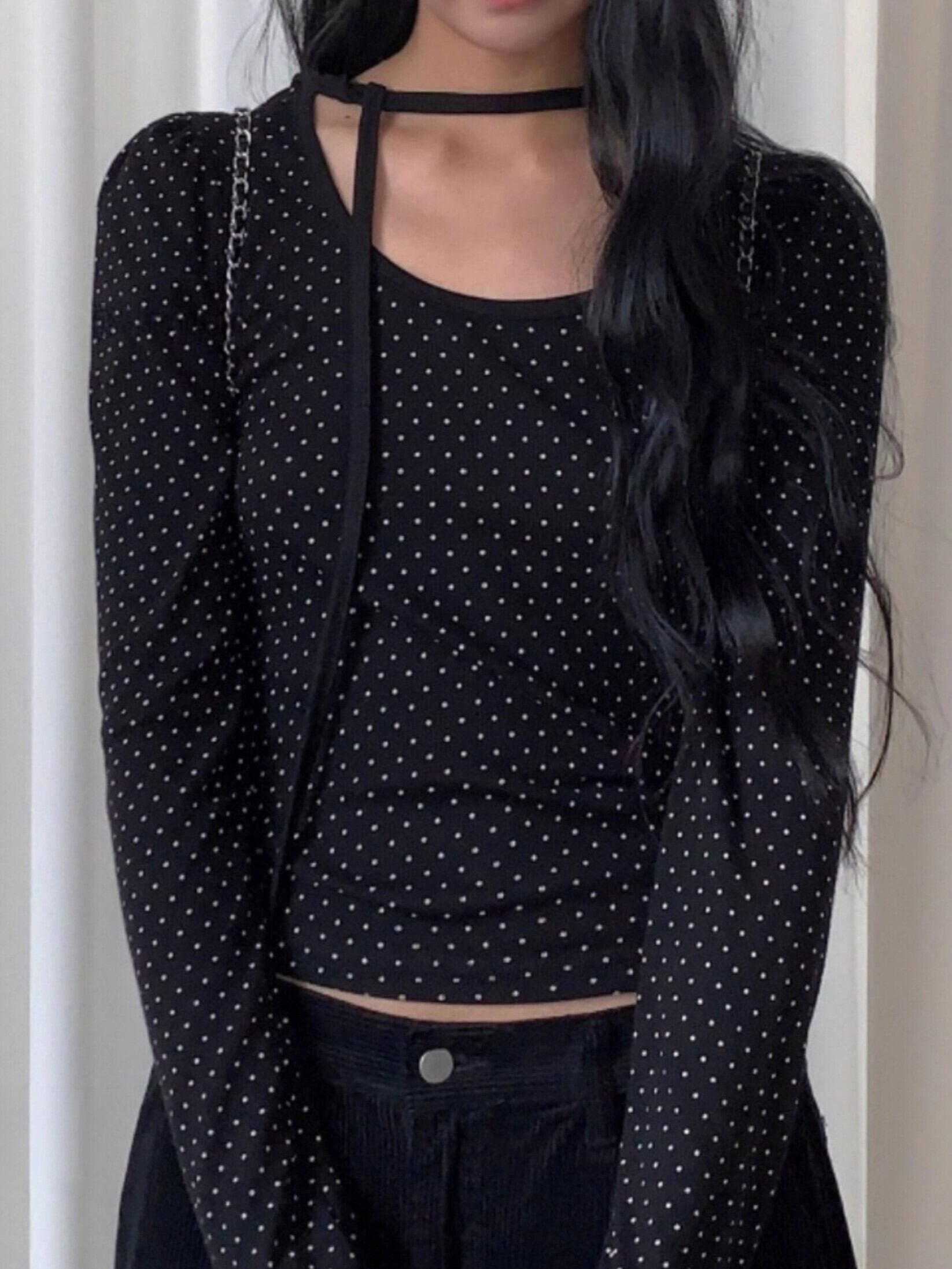 商品説明:ブラックベースにドット柄をあしらったクルーネックロンT。一枚で着ても存在感があり、モードやY2Kスタイルにも合わせやすいアイテムです。