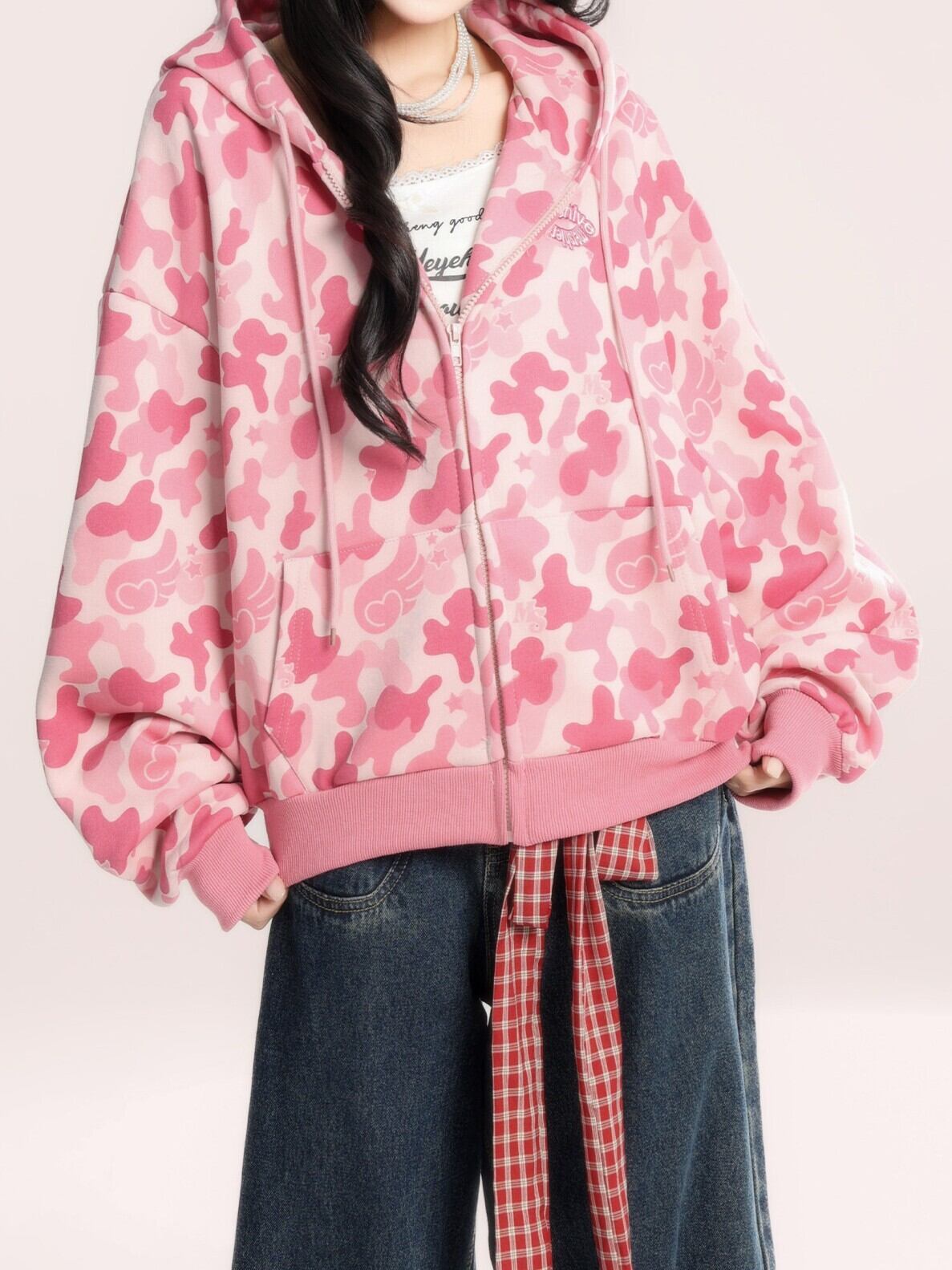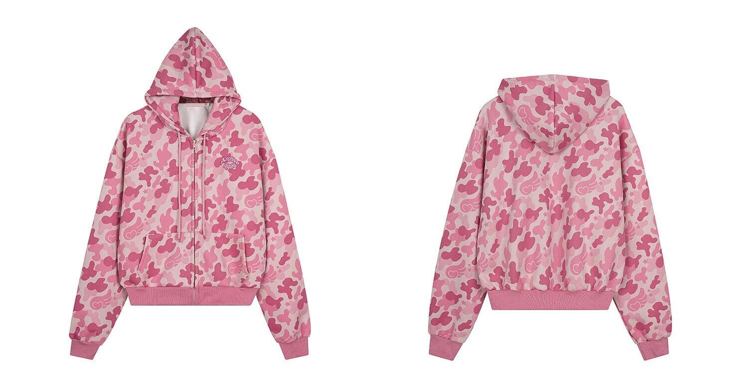 商品説明:カジュアルな迷彩デザインにピンクカラーを取り入れ、ストリート感と可愛さをミックス。デイリーからストリートスタイルまで活躍する一枚です。