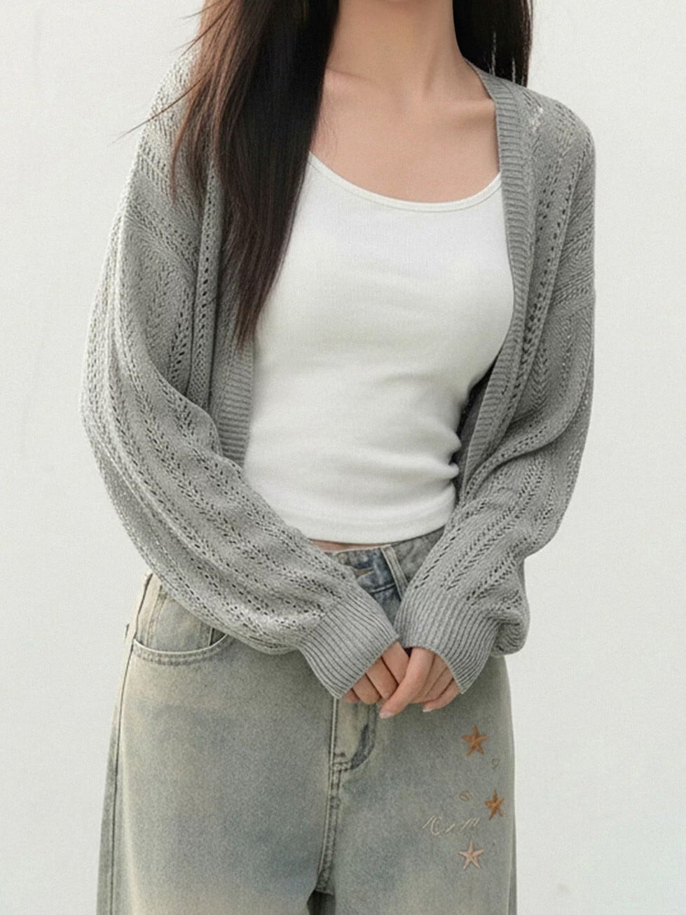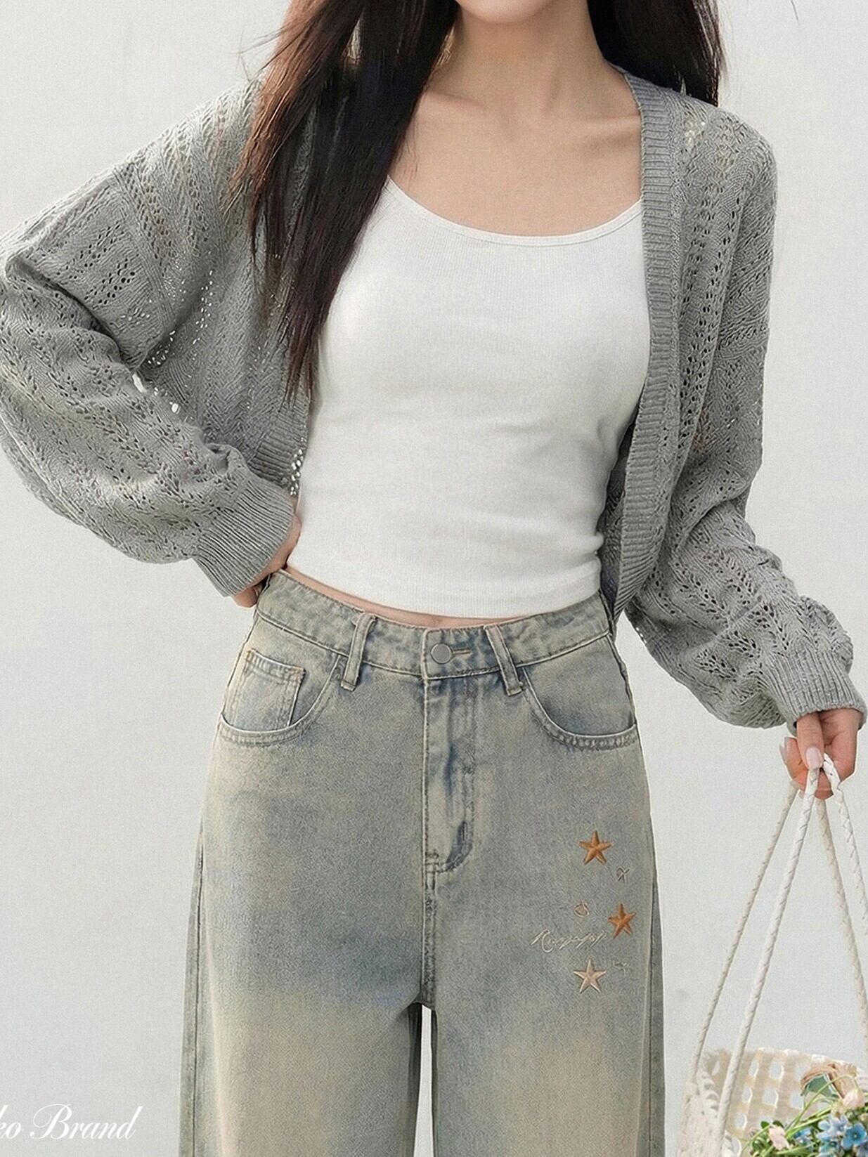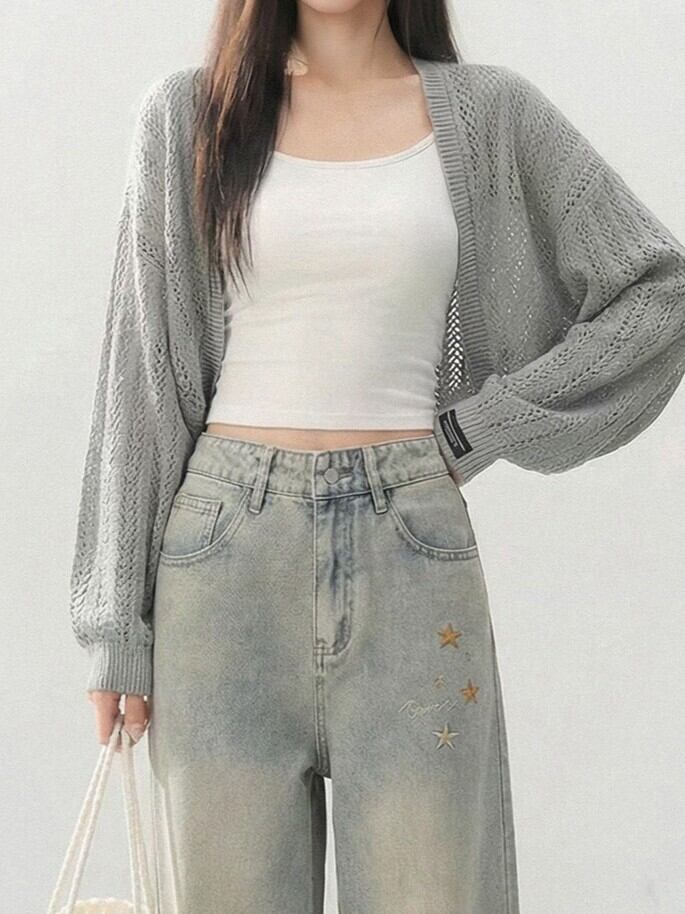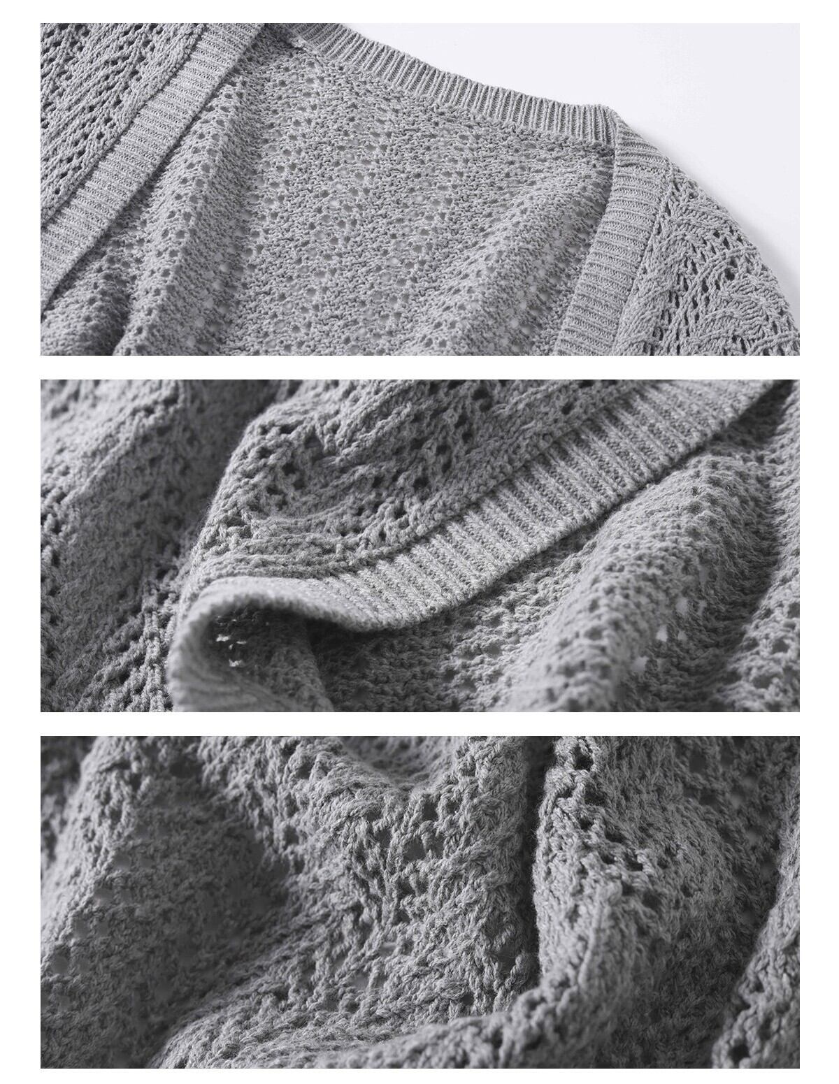 商品説明:透け感のあるメッシュデザインがポイントのショートニットカーディガン。